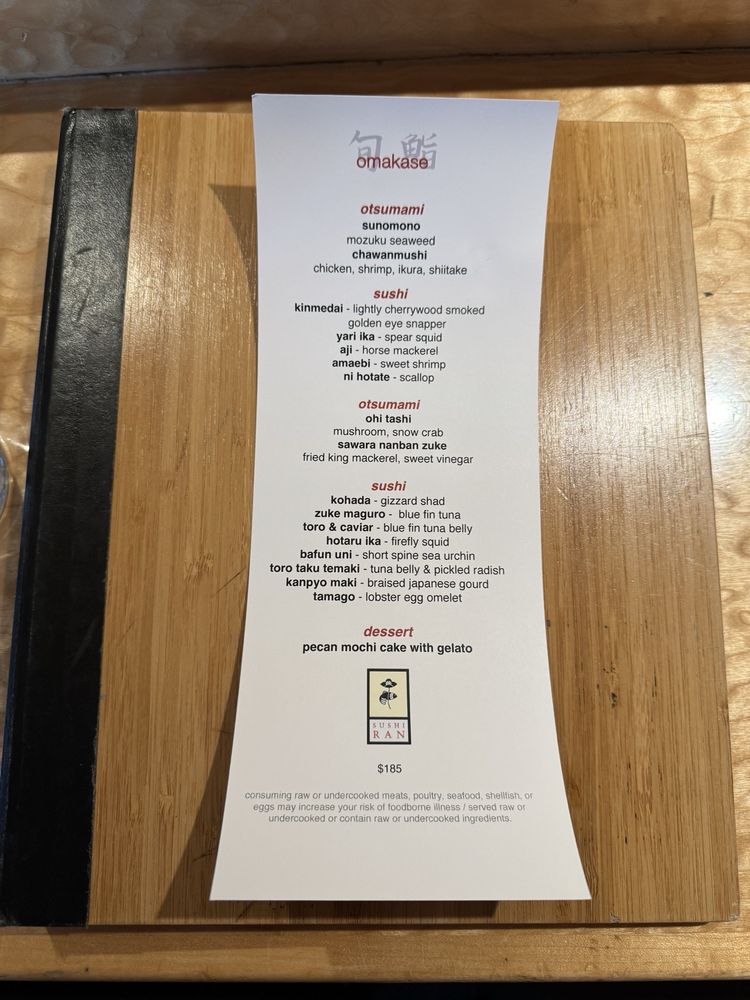 “ My fiancé booked omakase dinner here for my birthday and it was an amazing experience. Chef Eli was so nice and was a pleasure to talk to throughout our dinner. We enjoyed the setup of the experience. We booked 5:15pm and there was one other couple. So that was one chef per party which I think worked out well since we didn't feel rushed and they were pretty attentive. The omakase set was 18 course for $185 which we thought was fair, and we were stuffed at the end. It was about a 2 hour experience and everything was paced well. Everything was delicious. Some of my favorites were the toro and caviar, amaebi, uni, kohada, and toro hand roll. Chef gave me extra uni for my birthday which was so nice of him. He also shared that he actually made the pecan mochi cake for the menu which was a perfect end to dinner. Not too sweet and the textures worked nicely together. Sushi Ran rotates some of the offerings on the omakase menu every week. The firefly squid was a new addition for our day's tasting menu which was also new in general for us. Fiancé and I have been to a handful of omakase places so it's nice when we find out about new fishes/seafood. Sushi Ran definitely gets packed and they have lots of indoor/outdoor seating. Their regular menu looks pretty good too. Thank you for a wonderful birthday dinner! ”